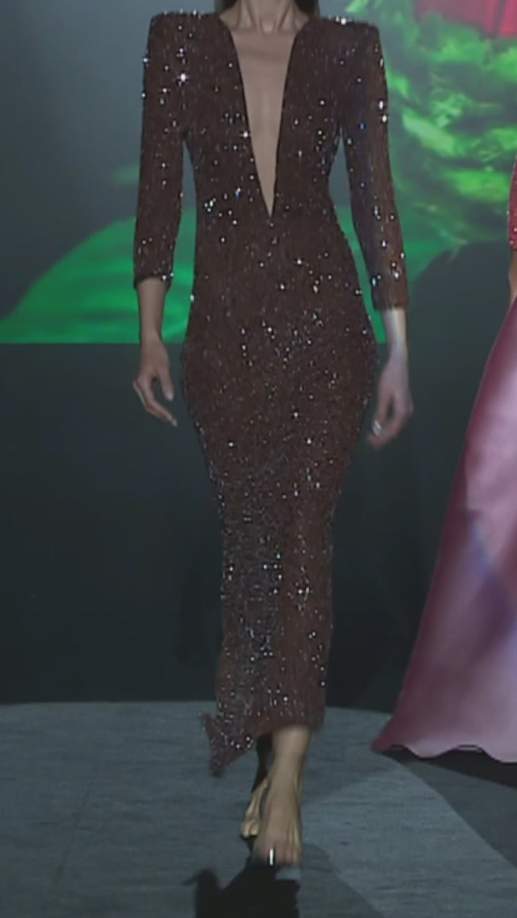 The Larisa dress interprets the floral silhouette through the dynamism of the fabric. Made of organza embroidered with micro bugle beads in a caldera tone, the design introduces a rich and changing visual texture, in which each movement generates subtle reflections. The embroidery is distributed intentionally, creating a play of light and shadow that accompanies the structure of the dress without overloading it.