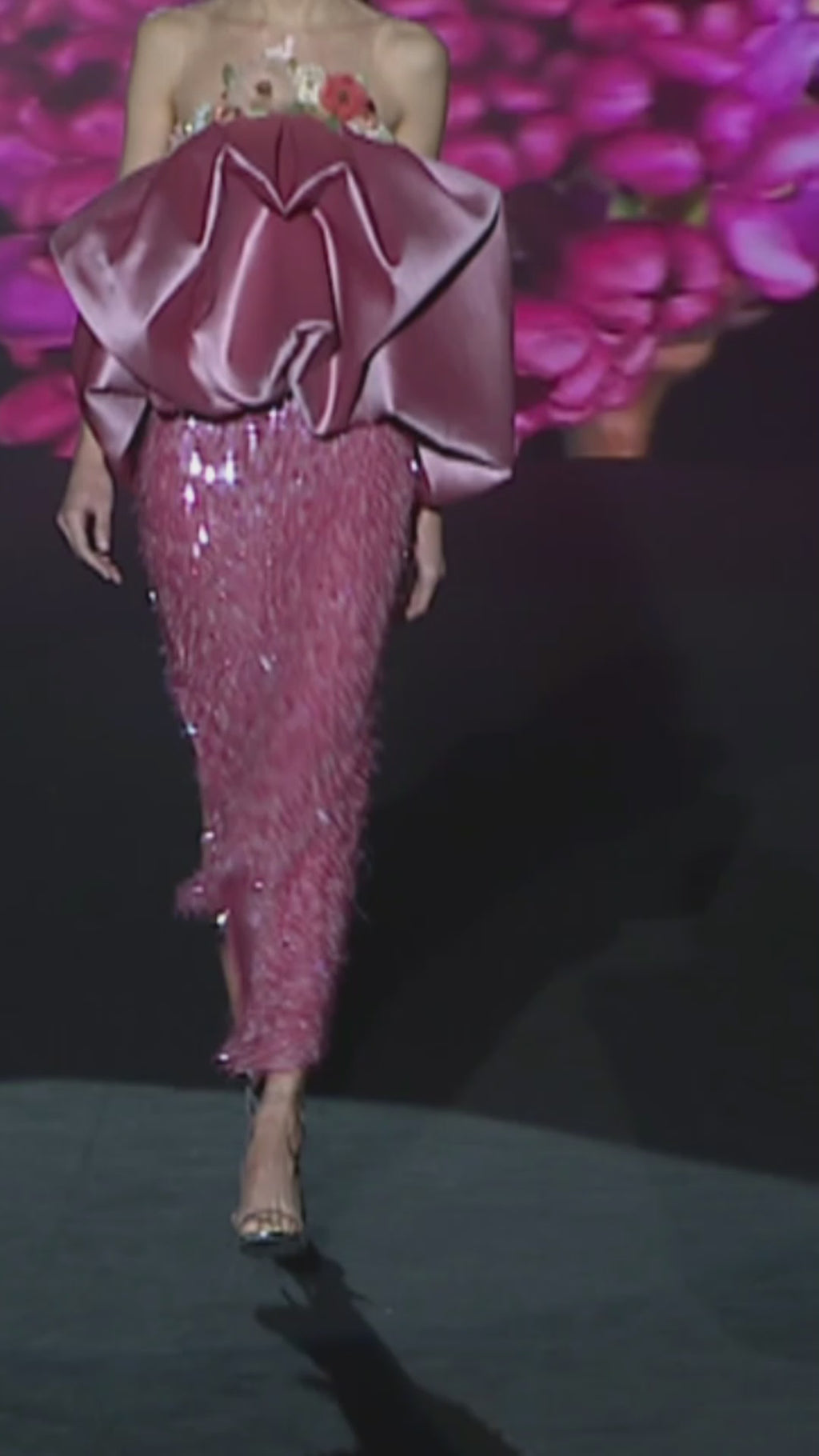 Lark & Leila set consisting of a structured mikado piqué bodice with a strapless neckline adorned with applied flowers. The Leila skirt, pencil-cut, features embroidered paillettes in rectangular patterns that catch the light when moving. A side slit and subtle asymmetry add dynamism.