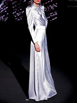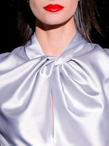 Body de fiesta realizado en satin color gris perla entrelazado en el cuello, mangas largas con pliegues en las copas.