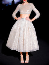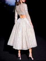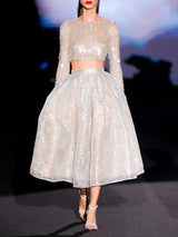Top crop realizado en chantilly bordado con maxi pailletes transparentes redondas , escote a caja y manga larga.